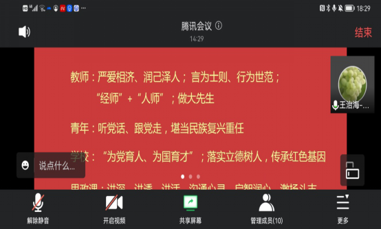 2022年4月25日上午,中共中央总书记、国家主席、中央军委主席习近平来到中国人民大学考察调研并发表重要讲话。为深入学习贯彻习近平总书记在中国人民大学考察时重要讲话精神, 5月11日下午BV伟德官方网站教工第一党支部组织全体党员认真学习讲话精神,并开展主题党日活动。王治海副经理以《推进课程思政建设 践行立德树人使命》为题,联系实际,结合自己学习习近平总书记重要讲话精神的体会,通过腾讯会议给大家讲了一堂专题党课。