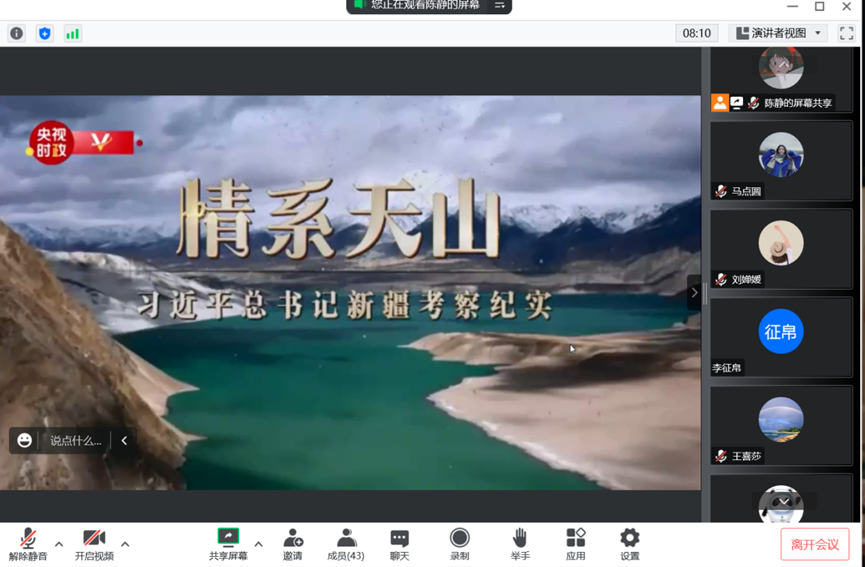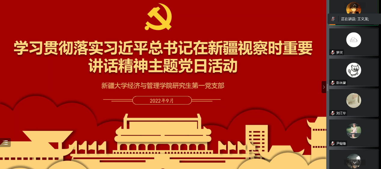 为深入学习贯彻落实习近平总书记在新疆视察时、特别是在伟德体育官方网站视察时重要讲话精神,切实把研究生党员的思想行动统一到讲话精神上来,BV伟德官方网站各研究生党支部近期召开学习贯彻落实习近平总书记在新疆视察时重要讲话精神主题党日活动,活动以线上方式开展。本次主题党日活动共分为两个阶段,第一阶段是学习贯彻落实习近平总书记在新疆视察时重要讲话精神和《情系天山——习近平总书记新疆考察纪实》纪录片的观看,第二阶段是围绕“作为中国特色社会主义、为中华民族努力奋斗的一代青年”进行学习讨论。