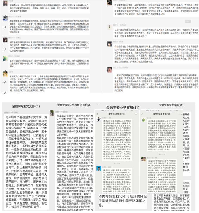 本科生金融学党支部金融21-1的付雨乐同学说:“胡教授讲座回顾了中国经济发展的伟大历程,对我国的经济建设成就进行了全面剖析和展示。我国的GDP总量跃居世界第二,同时也是世界第一制造大国、出口大国,人民的福祉大大提高。习近平总书记在党的二十大上提出了新的要求,要建设中国式现代化,向着第二个百年奋斗目标的实现迈进。二十大的召开令人兴奋,它无疑标志着中国的建设将迈入一个新的发展阶段。曾经的伟大成就是一代又一代人努力奋斗的结果,往后新的征程同样需要一代又一代的人努力。”