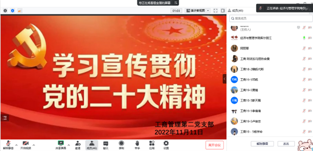 为学习宣传贯彻党的二十大精神,把全体党员的思想统一到党的二十大精神上来,把力量凝聚到党的二十大确定的各项任务上来,本科生工商管理第二党支部于2022年11月11日开展“学习党的二十大精神,踔厉奋发,勇毅前行”主题党日活动,工商第二支部全体党员和入党积极分子参加。