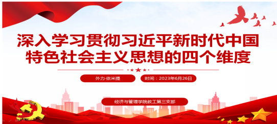 2023年6月26日下午,BV伟德官方网站外力•依米提副经理给管理科学与工程系党支部党员教师讲授了一堂主题为“深入学习贯彻习近平新时代中国特色社会主义思想的四个维度”的党课,第三党支部所有党员教师全程参加了党课学习。第三党支部由管理科学与工程系教师组成,现有教师18人,中共党员11人。其中,教授7人,副教授8人,具有博士以上学历教师10人,主要承担物流管理等本科专业人才培养工作。