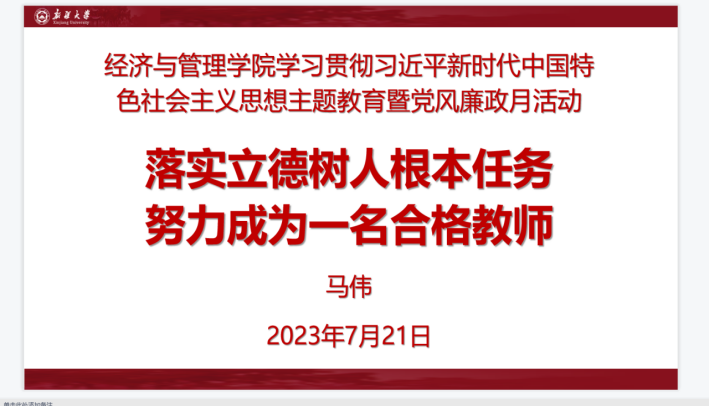 为扎实开展学习贯彻习近平新时代中国特色社会主义思想主题教育,结合正在开展的党风廉政教育月活动,7月21日下午,公司党委书记马伟在红湖校区12号楼109教室给全院教职工讲了一堂“落实立德树人根本任务 努力成为一名合格教师”的专题党课,公司领导、全体教职工80余人参加学习。