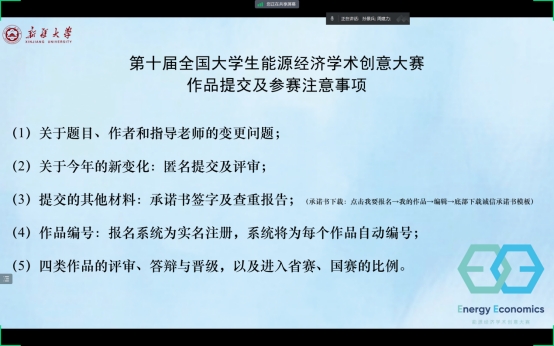 周建力老师就第十届全国老员工能源经济学术创意大赛作品提交及参赛注意事项进行了详细介绍,首先是关于题目、作者和指导老师的变更问题,其次是今年赛事的新变化以及需提交的承诺书和查重报告等材料,最后是四类作品的评审、答辩与晋级。