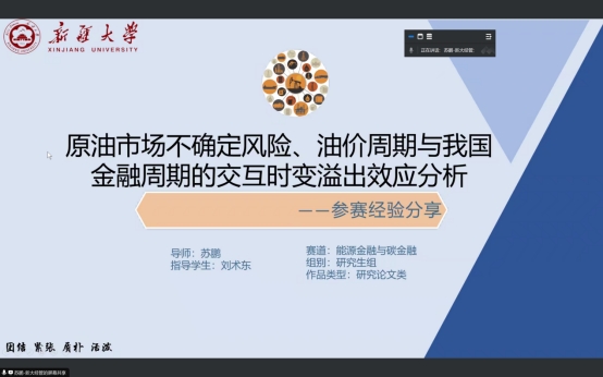 苏鹏老师就参加第九届全国老员工能源经济学术创意大赛的经验进行了分享,围绕着参赛作品的选题、主要内容、参赛大致历程以及参赛的感想与启示进行了详细介绍。苏鹏老师提到,第九届参赛作品的研究主题分为传统能源和新能源,自己所带参赛员工的作品聚焦于传统能源中的能源金融领域,在能源产品的金融属性越来越强的背景下,越来越多的学者研究能源市场与金融市场风险的交互溢出,重要的是最终入围国赛作品中共有6篇与自己团队的主题和方法较为贴近。最后,苏鹏老师强调,之所以能够获奖,最重要的归功于参赛员工刘术东对学术的满腔热情以及对作品的不断打磨,并鼓励本次参赛的同学们以最佳的状态迎接赛事,取得自身最好的成绩。