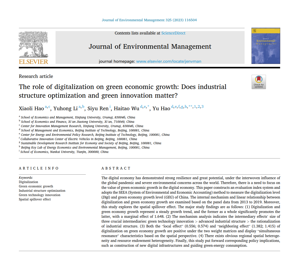 近日,BV伟德官方网站经济学专业2018级本科生李育红(导师:郝晓莉)的论文《The role of digitalization on green economic growth: Does industrial structure optimization and green innovation matter?》在国际期刊《Journal of Environmental Management》2023年第325卷发表。
