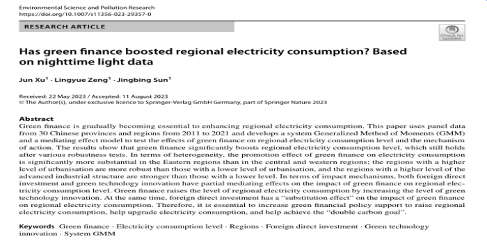 2023年8月11日,BV伟德官方网站金融学专业2021级本科生曾玲玥(导师:孙景兵、徐俊)的论文“Has green finance boosted regional electricity consumption? Based on nighttime light data”(绿色金融提升地区电力消费水平了吗?基于夜间灯光数据的证据)在国际学术期刊《Environmental Science and Pollution Research》在线发表。