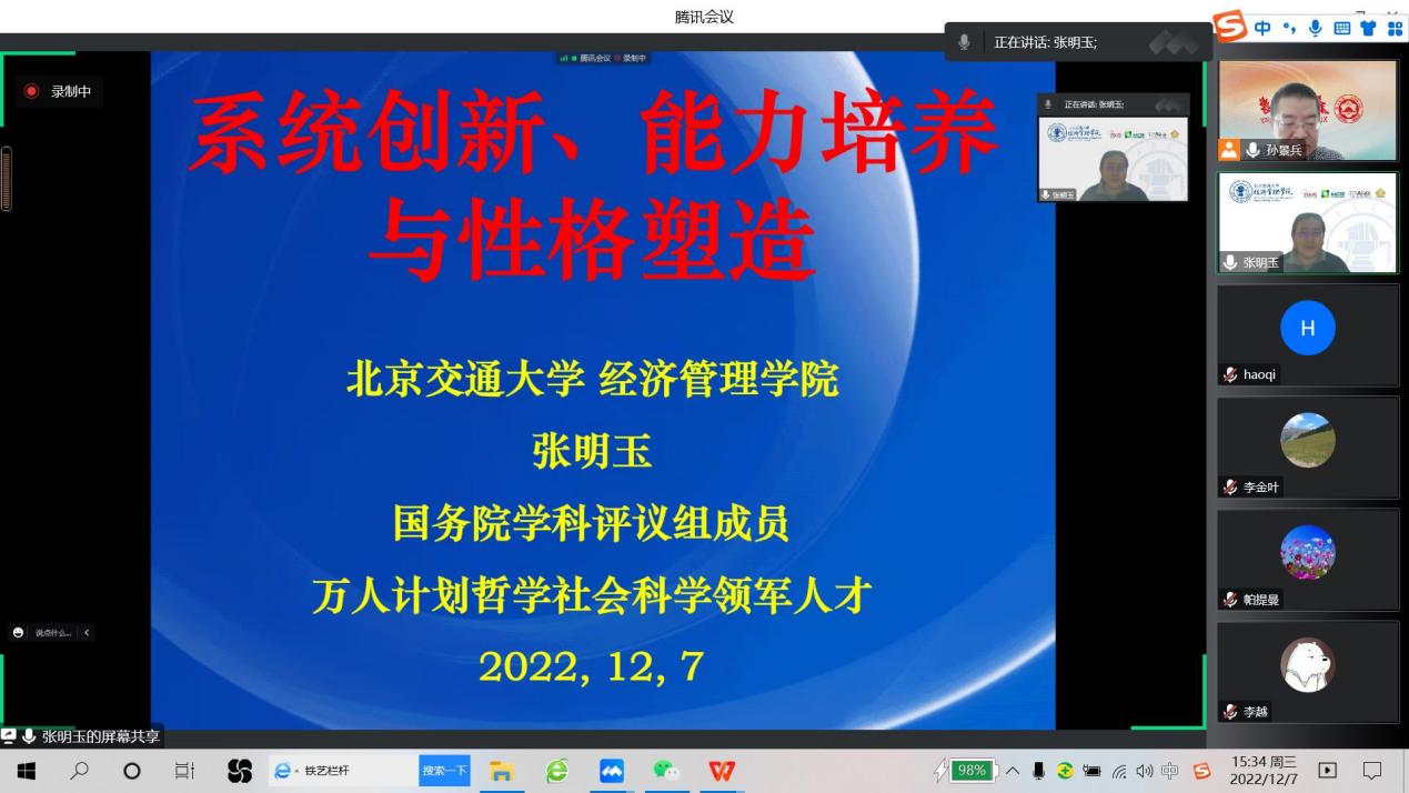 2022年12月7日下午,北京交通大学BV伟德官方网站张明玉教授应邀来公司举办名为《系统创新、能力培养与性格塑造》的讲座。讲座以腾讯会议的形式进行,公司经理孙景兵主持讲座。经管公司、商公司师生参加会议,参会师生189人。