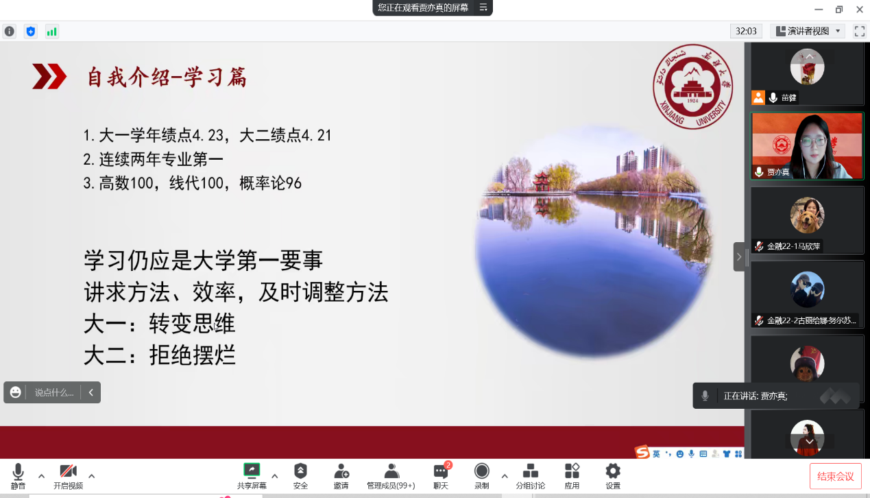 第一位分享的是金融20-3班的贾亦真同学,她从学习、竞赛、学术、社会实践、荣誉方面对自身情况做出了简要介绍,她强调要转变思维,拒绝“摆烂”,勇敢追求更多可能性。并分享自己的学习方法和经验,鼓励同学们善于把握自我发展的机会,保持专注,追求效率,找准定位,走好自己的路。在师生评价环节,贾亦真的班级同学、舍友和班主任赵玉强老师说她是一个谦虚且上进的员工,给予了高度评价。