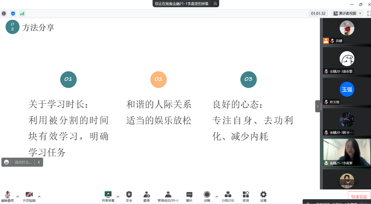 第二位分享的是金融21-1班的李嘉雯同学,她分别从入学以来学习情况、方法分享、线上学习情况和回顾反思四个方面向同学们介绍了自己的学习经验,提醒同学们要明确目标和自我定位,专注自身,减少“内耗”。随后,李嘉雯的班级同学、舍友评价她是一个活泼开朗、多才多艺且积极上进的员工,班主任朱新杰老师也对她提出赞扬,同时希望她能引领同学们在居家学习中保持乐观心态,砥砺前行。