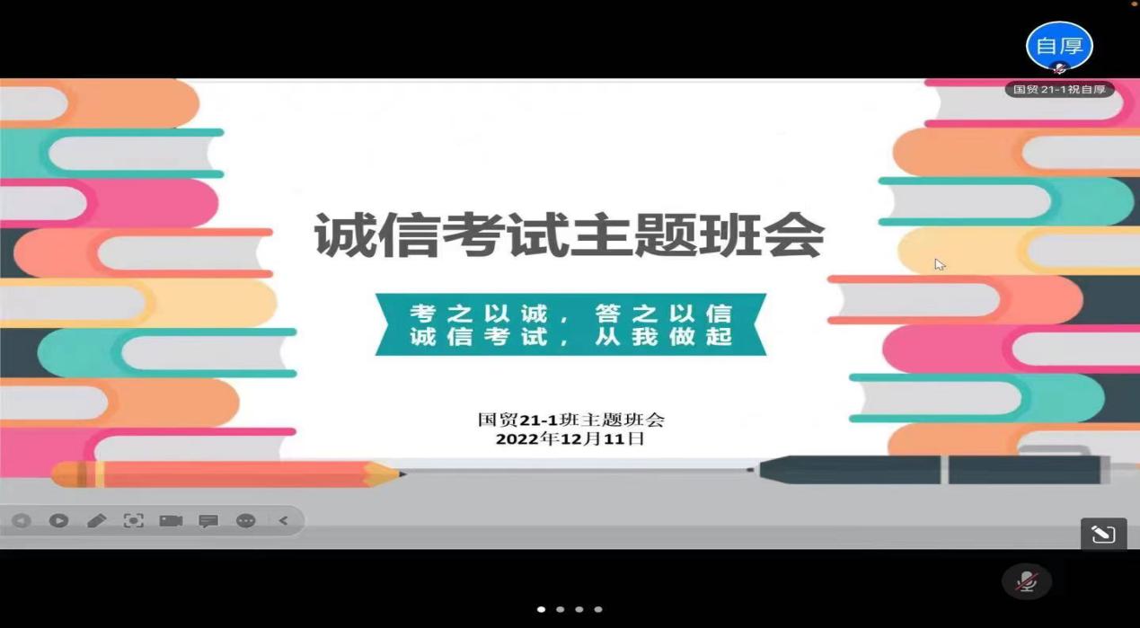 通过此次诚信考试主题班会的开展,有利于纠正部分同学的侥幸心理和错误想法,帮助同学们认识到不正当考试的危害以及严重后果,促使同学们把更多的心思放在认真复习上,树立不敢作弊、不想作弊、不能作弊观念,营造一个良好的考试氛围。愿每一位经管学子都能够不辜负自己的努力,在期末考试中取得自己理想的成绩。