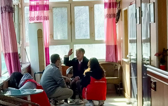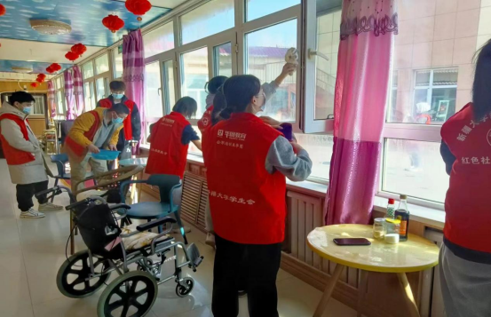来到福利院,同学们的身影吸引了福利院的老人们,他们认真的看着忙碌的志愿者们。一直在一旁关注着志愿者的一位白发匆匆的老人拉住了两位员工负责人。奶奶表现得特别激动,紧紧握着他们的双手不舍松开,哽咽着不断说着谢谢你们。从交谈中我们得知这位奶奶叫王玉华,今年已经92岁高龄。王玉华老人说她14岁入伍,入伍已经64年了,特别感谢志愿者的到来,因为我们的帮助让她有一个更窗明几净的生活环境,为此她感到生活更加舒适和美好,说着她举起右手向志愿者负责人郑重的敬了一个军礼。志愿者赶快扶住了王玉华老人,亲切的回答道:”奶奶,这都是我们应该做的。我们应该感谢你们,正是因为有了你们老一辈的冲锋在前,舍生坚守才有了我们现在的幸福生活,正是你们无私奉献的精神才促就了我们的这种服务精神。“在交流中王玉华老人还提到这些年来她共住进过三家养老院,这三家养老院不仅生活环境好,而且负责人更是无微不至的照顾她们,待她们亲如家人。老人谈到这些,提到习近平总书记对老年人养老工作的关心,正是因为总书记的惦念才让她们这一辈可以享受平静安逸的生活,老人们由衷地感谢党和国家对老年一辈的殷切关怀。听着老人的话,志愿者们都深受感触。