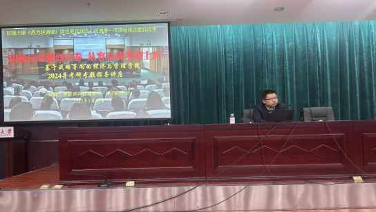 田老师向同学们展示了历届研究生录取数据,旨在让同学们认清当前的考研形势,同时就为什么考研、考研的意义展开,向同学们描述了研究生的意义及就业前景,解读了“考研”这两个字的含义,从专业角度、院校选择、个人学习能力加强等方面对同学们进行了指导,并就如何择校选专业、如何准备研究生各阶段考试、如何安排学习时间提出了自身见解,鼓励同学们能够在未来的学海中,以志为帆,以勤为桨,奋楫争流,扬帆启航。