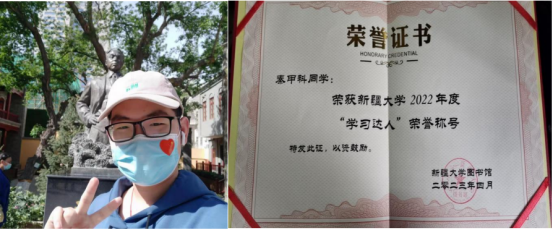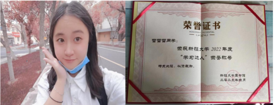 雷雪雪,金融学2019-1班员工,中共党员。“高中时,我曾无数次幻想大学的图书馆是什么样的?进入大学后,我怀着好奇又期待的心情走进心中这个“向往的地方”。如今回顾大学四年的时光,除了阅读书籍,记忆最深刻的便是大三时在图书馆准备考研的日子。当时夏天天气很热,知识很难,使人容易浮躁,但看到新大许许多多的同学在图书馆里认真的学习,此时我的心便静了下来,继续耐心的一点点学习考研知识,就这样慢慢的我成为了图书馆的“常客”。在这个过程中,我变得更加沉稳、冷静,不骄不躁,也更加深刻的体会到了氛围的重要性,它可以推动我们走的更久更远。在即将毕业离校之际,我想对学弟学妹们说不论我们是去图书馆阅读书籍修养心性,还是去图书馆备战考研实现理想,都要保持务实坚毅的态度,化被动学习为主动学习,把握好大学的时光,发现书中的美好,去到图书馆做更有意义的事情,用实际行动贯彻习近平新时代中国特色社会主义思想,将文化润疆理念根植进自身的茁壮成长中,通过读书学习增长知识、增加智慧、增强本领,努力成为一名对祖国、对新疆、对公司有用的经管类人才。”