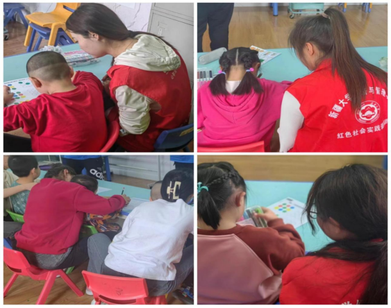 在乌鲁木齐市爱心园特殊教育公司,志愿者们成了三组,其中两组分别进入两个班进行协助教学,和小朋友们进行互动,另外一组同学则帮助整理材料间的一些物品,将物品规整到不同的柜子里并登记。