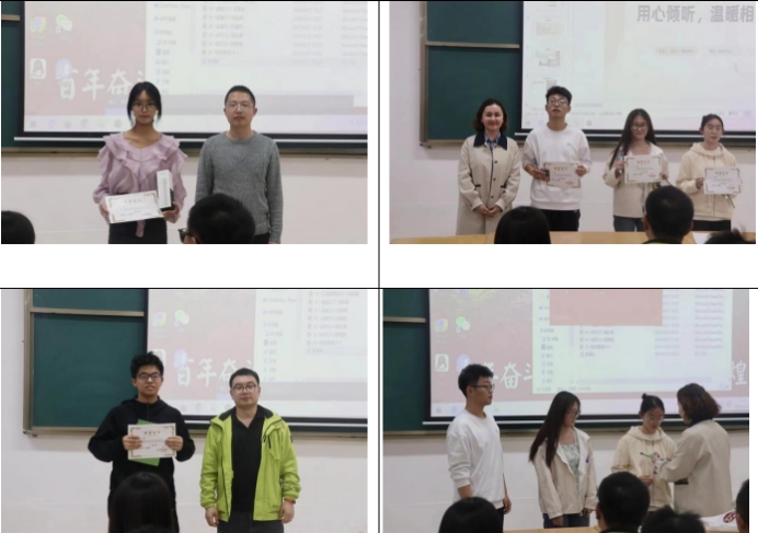 同时为了提高每一位心理委员的工作积极性,评委老师们又选择出了综合成绩排名靠前的的给叶楠、何永雪和王志远同学,并颁发优秀奖予以鼓励,期望他们日后有更精彩的表现,能够更加细致地帮助同学,疏导他们地心理问题,致力于提升班级的幸福感,也希望其他没有获奖的同学接下来能更加努力的提高自己的专业素养,在心理健康教育的路上更加闪耀。