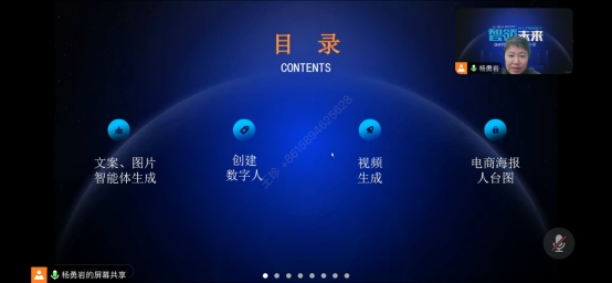 在文案图片智能生成板块,杨勇岩副经理详细介绍了各个AI工具的特色功能。以豆包为例,她演示了如何通过输入简单的指令,快速获取高质量的文案内容,并利用其关联功能生成与之匹配的图片素材。对于智普清言,她展示了如何调整参数以得到不同风格和需求的文案,如商务风格、文艺风格等,并且这些文案可以直接应用于商业宣传或者学术研究中的初步构思。师生们对这些功能表现出了浓厚的兴趣,纷纷在互动区留言提问,如如何确保生成文案的版权问题、如何根据特定行业需求优化生成结果等。