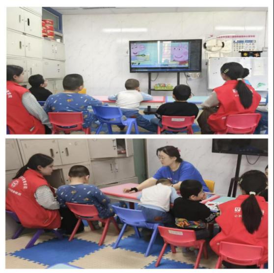 入班的志愿者们主要就是协助公司的老师们,帮助小朋友完成一系列的游戏互动。志愿者们陪小朋友们进行看图填色、画画等一系列手工类互动,并且在最后陪伴他们观看了动画片。各位志愿者基本上都是一对一地和小朋友进行搭档互动,在一个多小时的过程中他们一起玩耍、欢笑,也建立了较为深厚的友谊。看着自己和小朋友们一起完成的画作,以及游戏后小朋友们脸上开心清澈的笑容,志愿者们也流露出欣慰的表情和一种由衷的自豪感,也许这就是同学们乐意去成为一名志愿者的初衷。