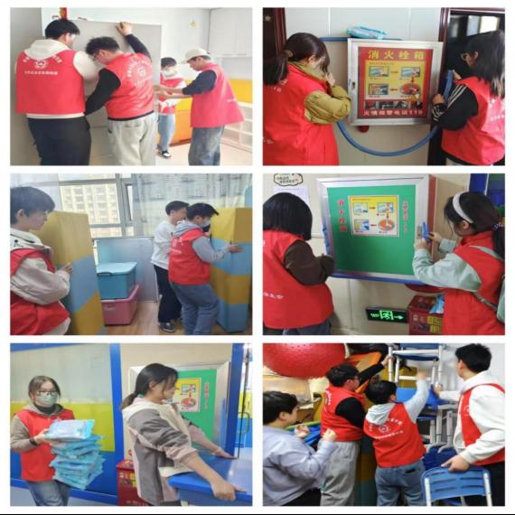 投入到教室整理和清洁的两组同学他们分工合作目的明确,有的擦拭座椅,有的整理器具,有的清洁地面,保证教室的每一个角落都焕然一新,为孩子们创造一个安静舒适的学习环境。并且考虑到特殊儿童在过道活动时会发生磕碰问题,我们和老师们一起给边角都安上了海绵护具,保障小朋友们的安全。