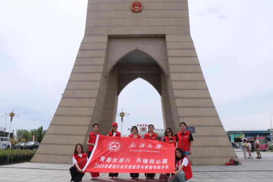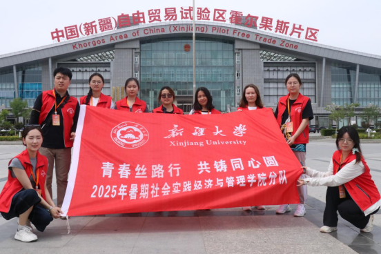 “青春丝路行,共铸同心圆”社会实践活动的第四站到达霍尔果斯口岸开展实地调研,深入考察中哈边境经济合作、口岸贸易及“一带一路”倡议下的区域发展成果。师生们一脚踏国门,远眺哈萨克斯坦风光,亲身感受中哈两国的深厚情谊、文化交融与经济往来,深刻体会到霍尔果斯作为“一带一路”关键节点的战略价值。