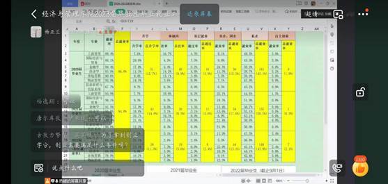 之后便由热娜老师进行了经管公司2020、2021、2022届毕业生就业情况的分析。热娜老师的分析让同学们意识到,对于就业一定要有清醒的认识,有清晰的规划,无论是选择考研升学还是步入社会就业,抓住秋招的机会,做好两手准 备。