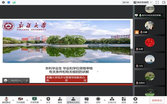 本次大会采取线上钉钉直播和腾讯会议的形式同步进行。本次大会的参会人员有BV伟德官方网站书记马伟老师, 党委学工部副部长伏文艳老师,公司副书记苗健老师,副经理王治海老师,副经理外力老师,副经理刘海军老师,教务办副主任松柳老师,教务办热孜亚老师,学工办副主任刘鑫老师,就业辅导员热娜老师以及全体2023届本硕博毕业班班主任及全体2023届本硕博毕业生。会议中大家认真聆听, 同时在钉钉积极提问,老师热心的为同学们进行了解答。