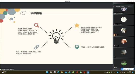 接下来,不论是2022届毕业、已成功入职的孙伟杰学长的简历撰写、面试经历等求职经验介绍,还是2022届考研成功上岸的杨思意学姐的时间规划、备考复习等考研方法, 都是满满的干货,对于2023届各位即将毕业的同学来说, 可谓是收获满满。