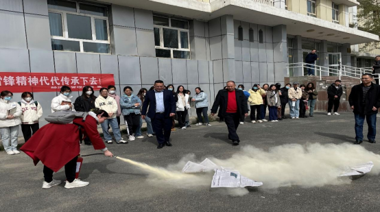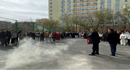 随着一阵急促的警报声响起,11号教学楼消防应急疏散演练正式开始。“火灾”发生后,公司在第一时间启动应急疏散预案,员工在院领导、辅导员、员工干部的指挥下快速有序地疏散出楼,按照规定路线从东西两侧门靠右弯腰下楼,冲向11号教学楼前的篮球场集合,班干部认真查验班级员工人数并迅速反馈给在场老师。整个逃生演练过程按照预定方案,严谨有序进行,同学们严肃认真,秩序井然,全体师生在两分钟内全部在篮球场上列好队,演练达到了预期的目的。在逃生环节演练结束后,本次消防演练进入到消防器材的使用教学环节。公司吐尔逊•司马义老师为大家详细讲解了消防安全知识、如何逃离火灾现场,并介绍了灭火器的构造和使用方法,强调在使用灭火器时需注意对准火源根部、算准风向和保持有效距离。吐尔逊老师对灭火器的使用进行了现场操作,同时邀请公司员工现场展示学习成效,对模拟火源进行了扑灭,赢得了现场师生的阵阵掌声。紧张而充实的消防演练活动至此接近尾声,最后由公司副经理外力·依米提老师做总结讲话。