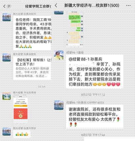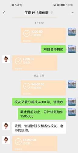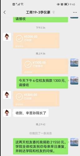 年8月27日,公司经理孙景兵老师在公司工会群、经管员工群发布募捐倡议,党委副书记苗健老师在班主任群发布募捐倡议。广大员工、经管师生纷纷伸出爱心援助之手,捐款、转发“水滴筹”公益平台求助信息,尽自己绵薄之力帮助这位困难员工的母亲。众志成城,越来越多的爱心助力从全国各地汇聚而来,师生的爱、员工的情让李仪豪同学获得了四面八方的温暖和力量。