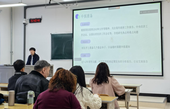 韩林芝教授的分享主题为“关于国家社会科学基金申报的几点思考”,主要围绕国社科项目申报前期准备、申报建议两个方面展开。韩教授首先强调,在国社科前期准备阶段,申请者可以根据国家重要会议文件精神、政府工作报告、中央经济工作会议、全国农村经济工作会议等寻找研究热点和难点问题;最好提前准备几个基金本子,以备随时课题申报通知;同时寻求好近2年的顶刊文献以及社科院等机构定期发布的分析报告、行业发展报告等。其次,韩教授提出三点具体建议,一是遵守申请要求及相应规范;二是联合相关单位,获取外部力量,积极吸纳专家意见,重视校院组织的申报前各项审核、评审环节;三是强化内部建设,打造研究“细分市场”竞争力,加强专业学习,跟踪新理论、新方法、新动向,正视挫折,积极面对。